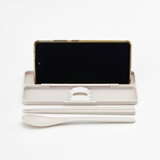 スマホスタンド付コンビセット(箸・スプーン)箸・スプーンのカトラリーセットです(箸・スプーン18cm)。箸とスプーンを取り出した本体がスマホスタンドになります。厚さ12mmまでのカバー付スマホにも対応。横置き、縦置きどちらも可能!※箸とスプーン収納時はスマホスタンドとして使用できません。