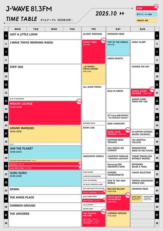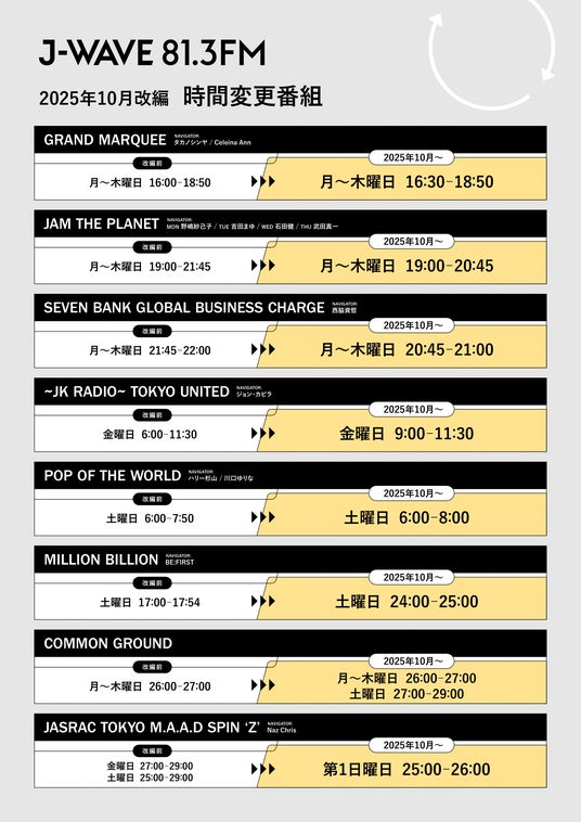 ラジオ局J-WAVE(81.3FM)は、2025年10月1日より秋の番組改編を実施します(改編率24.5%)。
