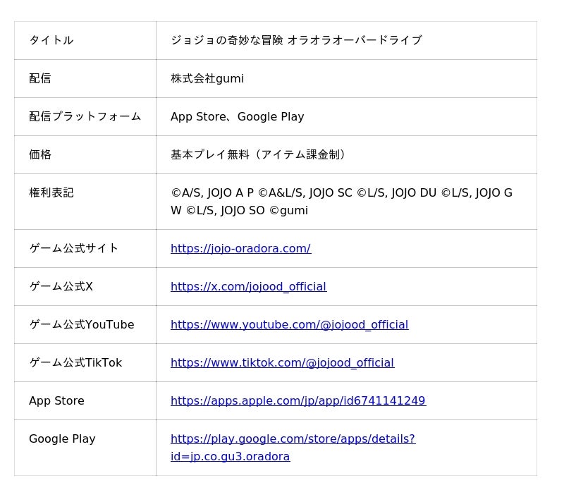 株式会社gumi(本社:東京都新宿区、代表取締役社長:川本 寛之)は、『ジョジョの奇妙な冒険』のアニメーションIPを活用した新作アプリゲーム『ジョジョの奇妙な冒険 オラオラオーバードライブ』が本日2025年9月25日にApp Store、Google Playにて配信を開始いたしましたことをお知らせいたします。