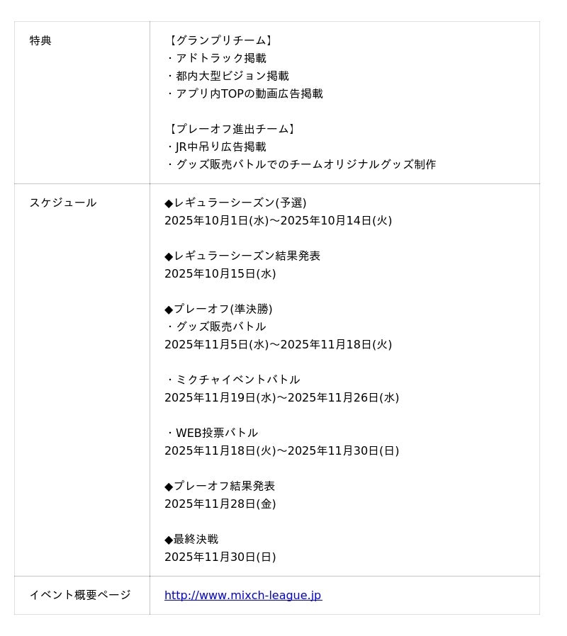 「ミクチャリーグ」は、「ミクチャ」でのライブ配信と動画投稿での獲得ポイント数や「ミクチャエール」( https://yell.mixch.tv/ )でのWEB投票数による審査を行い、グランプリ・準グランプリのチームを選出いたします。グランプリ受賞チームには特典総額200万円相当のアドトラックや都内大型ビジョンへの掲載など、今後の活躍を後押しする豪華特典が送られます。さらに、「ミクチャリーグ」では新たなイベントの仕組みである「レギュラーシーズン」と「プレーオフ」を導入するほか、チームビジュアルの制作や紹介動画の投稿も行い、参加ライバーの活躍とチーム戦の盛り上がりをより一層高めます。