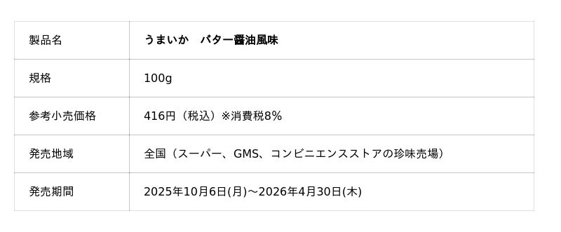 今回、この「うまいか」にこってり濃厚な「バター醤油風味」が新登場します。スナックや菓子売場でも人気の高い、濃厚なフレーバーに醤油風味のキレを加えた味わいで、定番や期間限定商品としても多く採用されるフレーバーです。満足感あふれる濃厚な味わいで、お腹も心もたっぷり満たす商品として、期間限定で発売します。