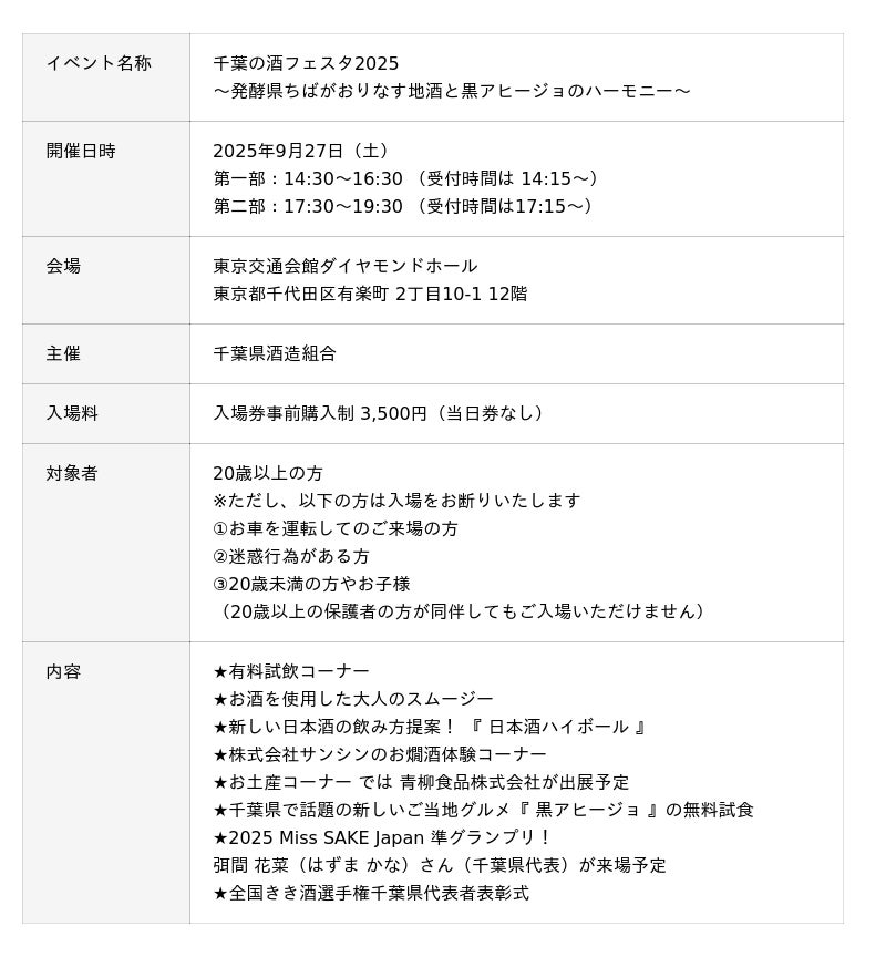 「千葉の酒フェスタ2025」は、千葉県内17の酒蔵が集結し、地元銘柄を中心に100種類以上の日本酒を楽しめるイベントです。