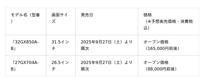 LGエレクトロニクス・ジャパン株式会社(代表取締役:孫 成周(ソン・ソンジュウ)、本社:東京都中央区)は、有機ELを採用したゲーミングモニター「LG UltraGear(TM) OLED」シリーズの新モデルとして、31.5インチ4K解像度の「32GX850A-B」と、26.5インチWQHD解像度の「27GX704A-B」を、2025年9月27日(土)より順次発売します。