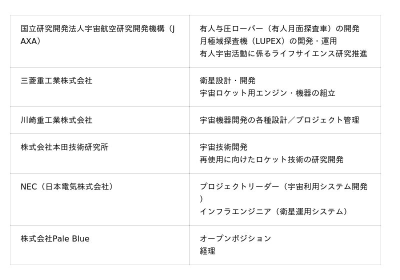 本特集には、国立研究開発法人宇宙航空研究開発機構(JAXA)、三菱重工業株式会社、川崎重工業株式会社、株式会社本田技術研究所、NEC(日本電気株式会社)、東京大学発スタートアップのPale Blueの6団体が参画。月面探査車や人工衛星をはじめとする宇宙機器の設計・開発、宇宙利用システム開発のプロジェクトリーダーなど、12職種を一斉に募集します。全てのポジションにおいて、宇宙産業に携わった経験は不問。多くの方に挑戦の機会が開かれます。