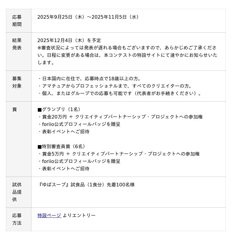 クリエイターのポートフォリオプラットフォーム「foriio」を運営する株式会社foriio(代表取締役:山田 寛仁、本社:東京都新宿区)は、株式会社ミナミ食品(代表取締役:南 辰典、本社:岩手県九戸郡洋野町)を主催とし、同社ブランドの国内外展開を加速させる施策の一環として、共創型ビジュアルデザインコンテスト「CREATIVE BRIDGE AWARD - foriio Business Creation Lab -」を2025年9月25日(木)から11月5日(水)の期間で開催いたします。