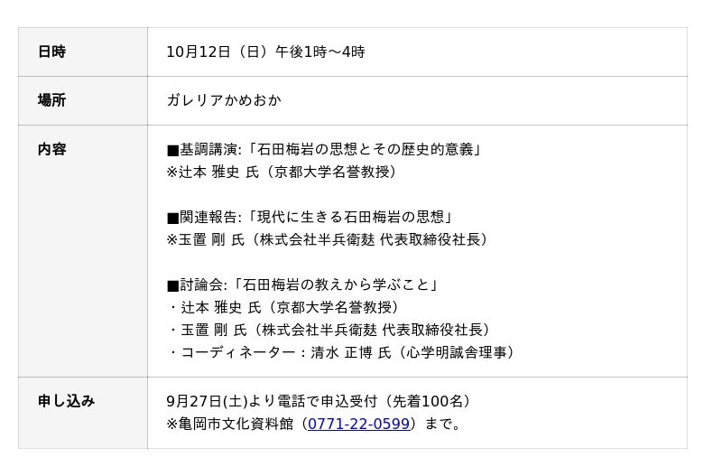 現代社会が直面する課題を解くヒントとして、石田梅岩が説いた思想の現代的意義を、貴重な直筆資料や多彩な関連イベントを通じてお伝えします。