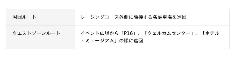 イベント広場からレーシングコースに隣接する各駐車場、ウェルカムセンター、ホテル、ミュージアムを巡回する
