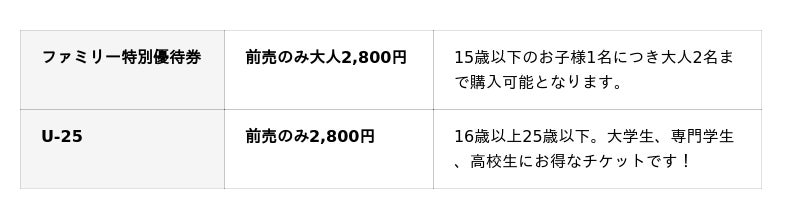 また、15歳以下のお子さまと一緒にご来場されるファミリー向けチケットや、16歳~25歳の方を対象としたU-25チケットを特別価格2,800円で販売中です。
