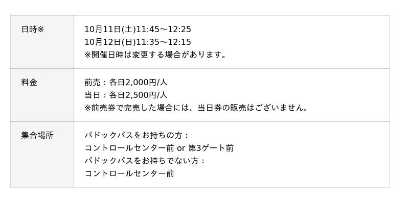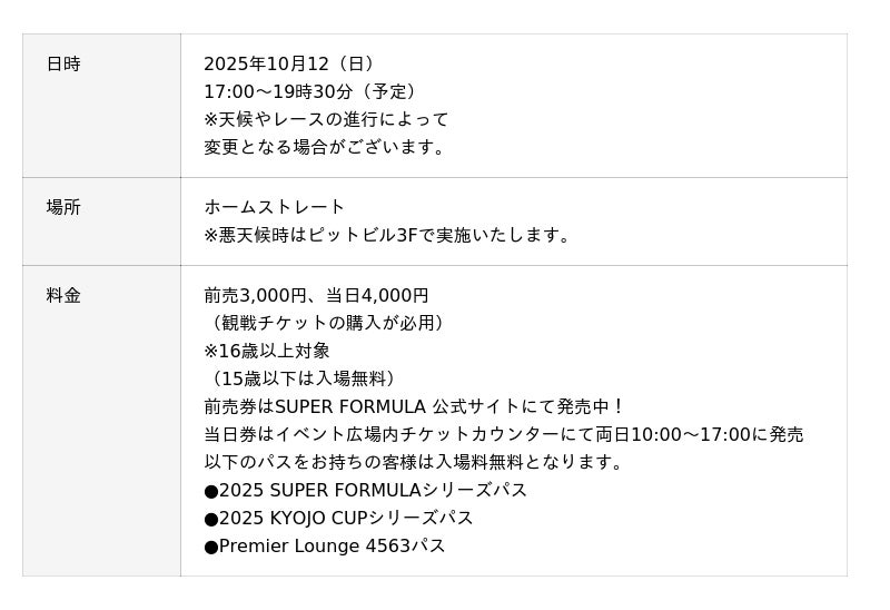 全日本スーパーフォーミュラ選手権(以下「SUPER FORMULA」)を開催する富士スピードウェイ株式会社(本社:静岡県駿東郡小山町、代表取締役 社長執行役員:酒井 良、以下「富士スピードウェイ」)および株式会社日本レースプロモーション(本社:東京都千代田区、代表取締役社長:上野 禎久、以下「JRP」)は、2025年10月10日(金)・11日(土)・12日(日)の3日間に富士スピードウェイで行われる「2025年 全日本スーパーフォーミュラ選手権 第9戦・第10戦富士大会」に併せて実施する、追加コンテンツの概要について発表いたしました。