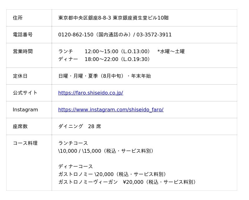 「ファロ資生堂」は、2001年竣工の現東京銀座資生堂ビルに本格的イタリア料理店としてオープンし、2018年10月からは新生「FARO」として生まれ変わりました。銀座の地から世界に光を放つレストランを目指して、「FARO」(=灯台)の名の如く、イタリアンの技術と日本の食材への敬意から生まれるモダンでオリジナリティあふれる新しい食体験を発信してまいります。