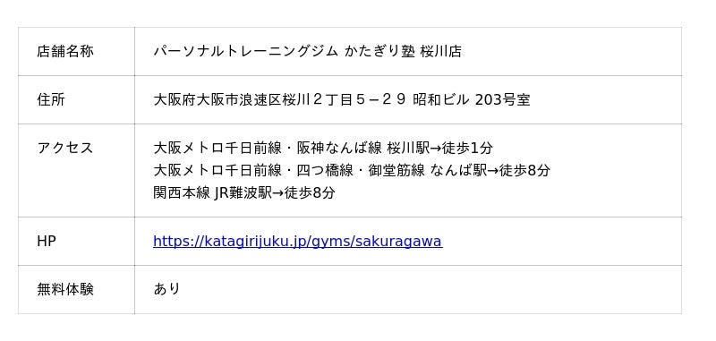 『綺麗なダイエット』というコンセプトを軸に、全国で勢力的にフィットネスの普及に貢献しているパーソナルトレーニングジム『かたぎり塾』は、桜川店では専任トレーナーの宇野が一人ひとりの目的や体力に合わせた丁寧な指導を行い、初心者から経験者まで安心して通える環境を提供しています。店舗は桜川駅から徒歩1分、JR難波駅・なんば駅から徒歩8分、難波エリアからもアクセスしやすい立地に位置しており、仕事帰りや買い物のついでにも気軽に利用可能。忙しい社会人から子育て世代まで幅広い方に選ばれています。