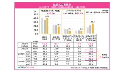 マイナビは9月24日に、同社の運営する結婚準備情報サイト「マイナビウエディング」が、2024年7月~2025年6月の期間に結婚した、または結婚式を行った全国の20~49歳の男女を対象に実施した、「2025年 結婚・結婚式の実態調査」の結果を発表した。同調査は、7月25~31日の期間に行われ、2024年7月~2025年6月の期間に結婚した人1115名、同期間に結婚式を実施した人1000名から有効回答を得ている。