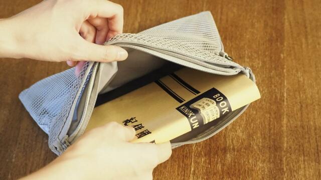 「ポリエステルダブルファスナーケース」のLサイズは単行本1冊、文庫本2冊を入れられる収納力がありました。