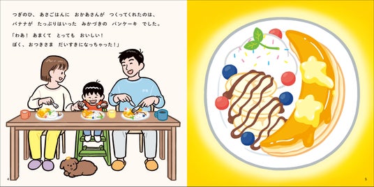 次の日、おうちの食卓には、「バナナが添えられた特製パンケーキ」が登場!