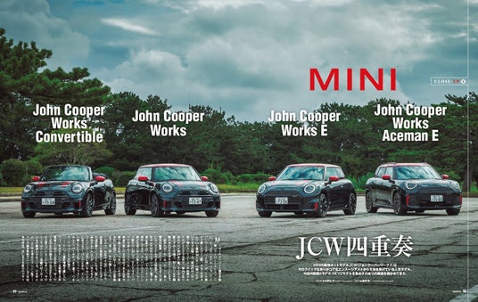 【CLOSE- UP】MINIの最強ホットモデル、JCW(ジョンクーパーワークス)は、そのストイックな走りがコアなエンスージアストの支持を集めている人気モデル。今回は内燃機関2モデル、電気自動車2モデルを集め、それぞれの走りの真価を確かめた。