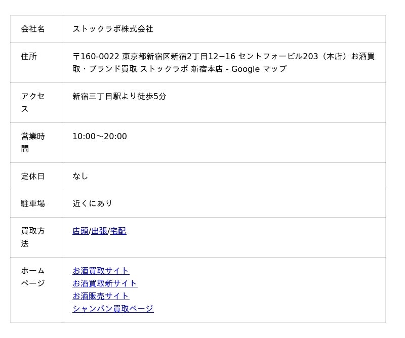 お酒買取専門店ストックラボのポメリー買取の特徴を3つに分けて解説します。まずは、ストックラボの業者の概要をご確認ください。