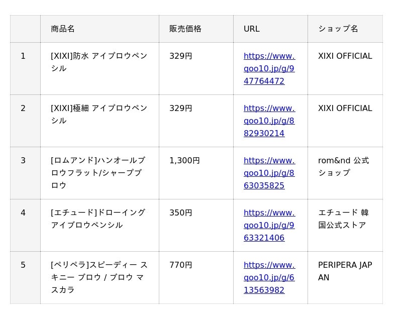 今回の『アイブロウ』ランキングの1位は、[XIXI]防水 アイブロウペンシル。3つの太さで描ける三角形のペン先が特徴です。2位は、同じ[XIXI]から極細 アイブロウペンシル。極細のペン先で、一本一本描くように使えます。3位は[ロムアンド]ハンオールブロウフラット/シャープブロウ。すっぴんの時もメイクしている時も使いやすい、ナチュラルな発色のペンシルです。