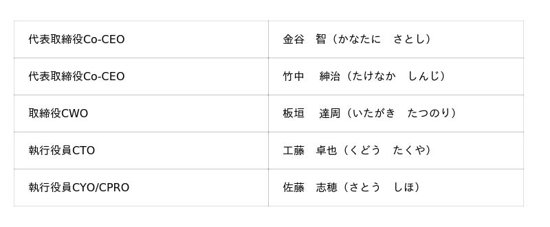これまで代表取締役社長を務めてきた金谷智とタッグを組み、竹中紳治が代表取締役Co-CEOに、板垣達周が取締役に、執行役員に工藤卓也・佐藤志穂が就任します。