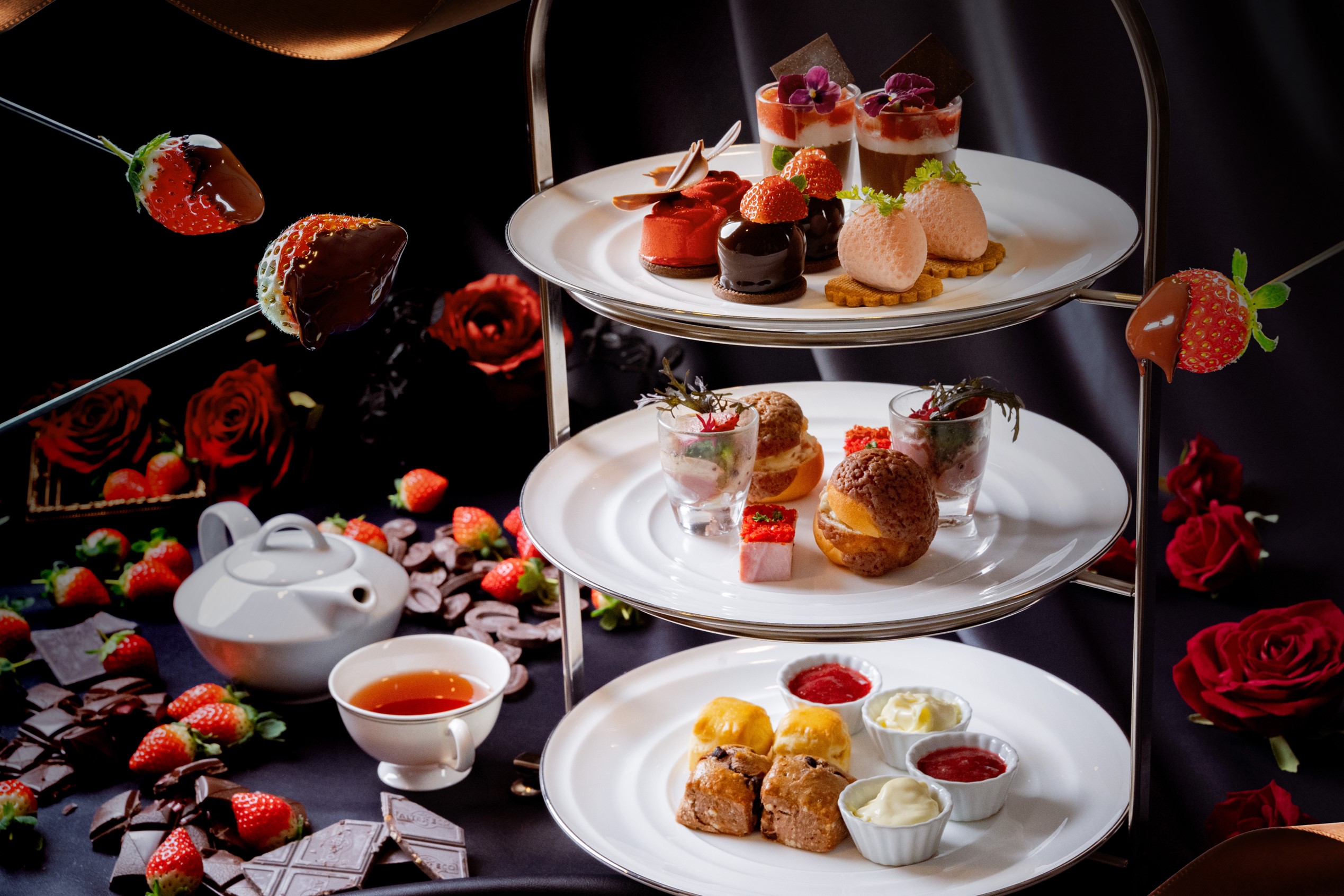 ホテルでの贅沢なひとときを楽しむために、プラン限定で用意した黒糖尽くしのアフタヌーンティーです。ティースタンドを彩るスイーツの中でも、特に目を引くパフェは、チュイル(*3)やクリームに黒糖を使用し、素材本来の味わいを引き立てます。また、フルーツをふんだんに使用した黒糖ぜんざいなど、見た目にも華やかなスイーツが並びます。セイボリーには、黒糖を練りこみ香りを閉じ込めたエビのスライダーなど、黒糖のアクセントを効かせました。黒糖の深いコクや甘みを活かしたティーセットで、黒糖を心ゆくまで堪能できます。