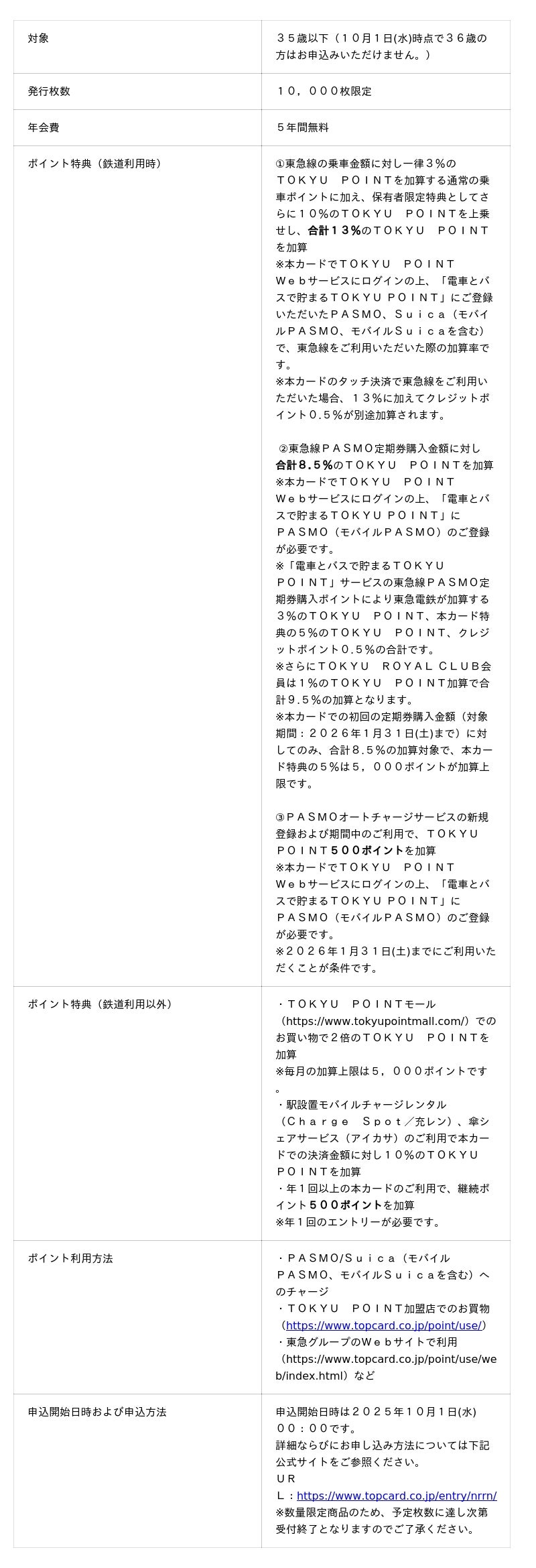 本カードは、東急線の乗車金額に対し一律3%のTOKYU POINT※1を加算する通常の乗車ポイント※2に加え、保有者限定特典としてさらに10%のTOKYU POINTを上乗せする※3大変おトクなクレジットカードです。乗車回数条件なしで合計13%のTOKYU POINTを加算する本カードは、関東大手民鉄最大の乗車ポイント加算率となります。※4また、本カードの有効期限である5年間年会費が無料で、駅周辺でのシェアリングサービスや対象のECサイトご利用時などの鉄道利用以外の場面でもTOKYU POINTの加算特典があります。表面は、「東急線キャラクター のるるん」を全面にデザインすることで、親しみを持っていただくとともに、カード番号などの情報を裏面に集約し、セキュリティ面にも配慮したカードとなります。
