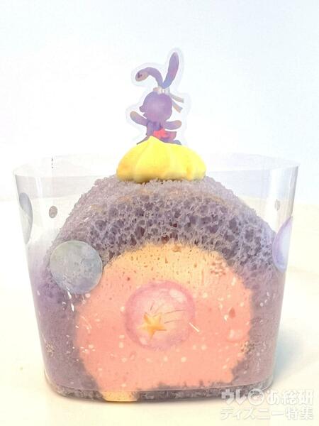 ラベンダーカラーのロールケーキを縦に、中のクリームは淡いオレンジピンク。