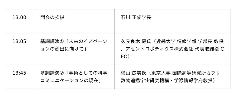 基調講演では、ソニー・コンピュータエンタテイメントで「プレイステーション」の開発を指揮され、 現在は近畿大学情報学部学部長のほか、アセントロボティクス株式会社CEO代表取締役を務める久夛良木健氏、学士から博士までを本学で学び、現在は東京大学国際高等研究所カブリ数物連携宇宙研究機構・ 学際情報学府教授の横山広美氏の2名をお招きします。