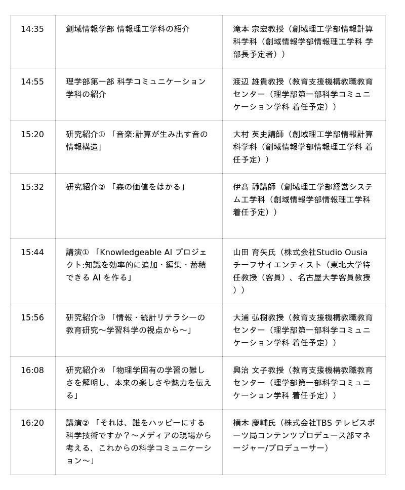今回のフォーラムでは、両学科に着任予定の教員が、設置の目的や教育の特徴、進学の魅力を説明するとともに、研究をわかりやすく紹介します。また、情報科学技術分野でご活躍されている方々にもご登壇いただきます。