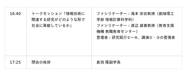 本フォーラムをとおして、情報科学技術の最前線や、社会への貢献事例について発信し、本学の教育研究、人材育成、科学コミュニケーションへの理解を深めていただける内容となっています。