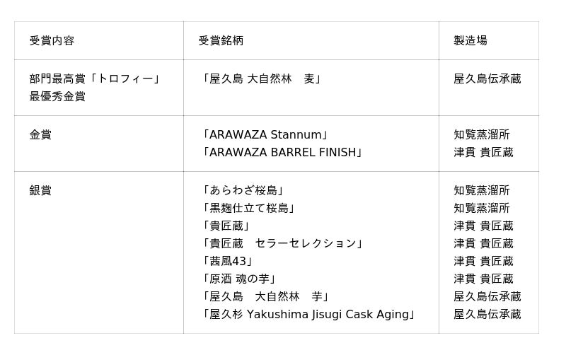今年で30回目を迎えるISC(International Spirits Challenge)は、イギリスの酒類専門出版社「ドリンクス・インターナショナル」が主催するスピリッツを対象にした品質・味覚競技会です。焼酎部門のほか、ジン、ウォッカ、テキーラなど複数の部門に分かれて競われ、世界で最も権威のあるコンペティションの一つとして知られています。著名なスピリッツ業界の専門家によるブラインド・テイスティングで審査され、製品は各カテゴリー別に、金賞・銀賞・銅賞が選出されます。また、金賞受賞製品の中でも、優れた製品に授与される最優秀金賞、さらにカテゴリー最高賞である「トロフィー」の称号が設けられています。「トロフィー」は、製品が受け取ることができる最高の栄誉になります。・公式ウェブサイト:https://internationalspiritschallenge.com
