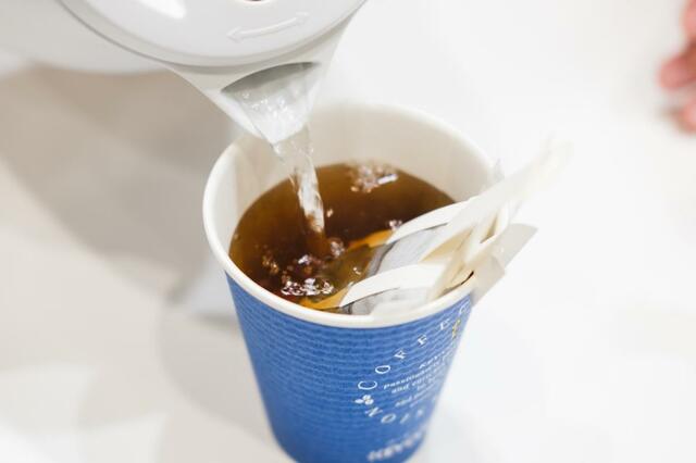 カップにセットしてお湯を注ぎ、ティーバッグのように軽く動かすだけで完成します。