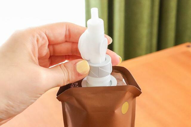 詰替用についているキャップを取り、封をするようにノズルをつけるだけ。