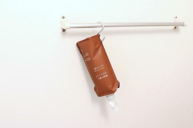 お風呂場で使うときはS字フックにぶら下げます。パッケージの底面サイドに穴が空いているので差し込むだけでOK。