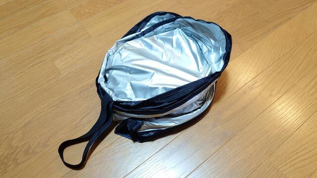 折り畳み方は、ポップアップテントに似ています。最初に2つ折りしたら、円状のフレームを捻じるようにして折り曲げていき、収まりがいい形に整えるだけ。