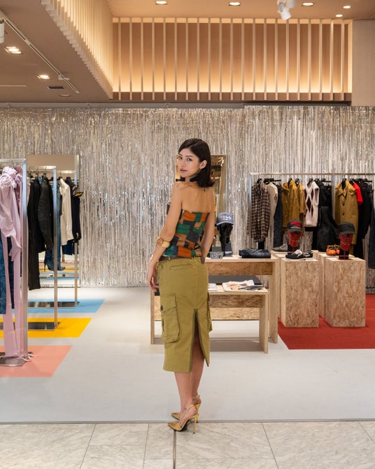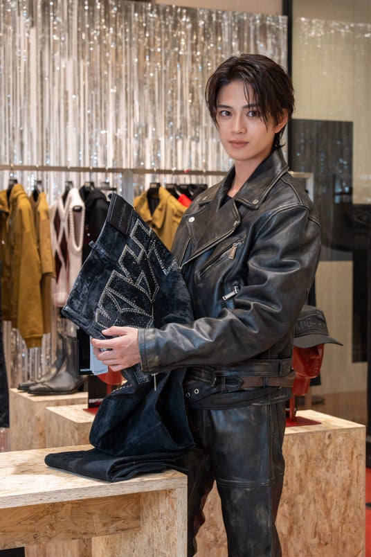 俳優の岩瀬洋志さんは、マリアーノとのコラボレーションコレクションから、レザージャケットとレザーパンツをセレクト。ヴィンテージ加工や複雑なベルトのデザインなど、ディースクエアードらしさとマリアーノらしさが見事に調和したアイテムです。作曲・作詞・ダンスの振付まで手掛けるトリリンガル(日本語・英語・韓国語)ソロアーティストのNOAさんは、マリアーノとのコラボレーションコレクションからジャケットスタイルを着用。2枚に重ねたパンツと、深くVの開いたシャツ、構築的なジャケットで洗練されたスタイルに仕上げています。モデルの南部桃伽さんは、アップサイクルを得意とするベターとのコラボレーションコレクションから、キャップをジャケットの肩部分にドッキングしたジャケットと、デニムパンツを裁断してロングブーツにリメイクしたアイテムをチョイスしました。モデルの新音さんもベターとのコラボレーションコレクションより、デニムパンツに付けられるレザーパッチを縫い合わせたトップスを、パンツをリメイクしたスカートに合わせました。5つのブランドとのコラボレーションコレクションが一堂に揃った店内にて、それぞれのクリエイターとの協業によるデザイン性の高いアイテム達を楽しみました。