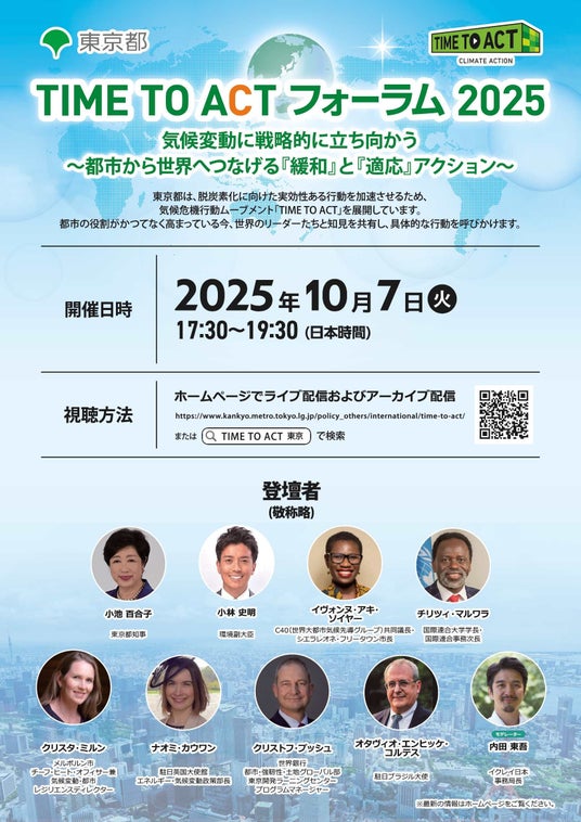 このたび、東京都主催で「TIME TO ACTフォーラム2025」を下記のとおり開催いたします。本年のテーマは「気候変動に戦略的に立ち向かう~都市から世界へつなげる『緩和』と『適応』アクション~」。気候変動対策で先進的に取り組む都市や国家の代表、さらに世界の議論をリードする国際機関にご参加いただきます。