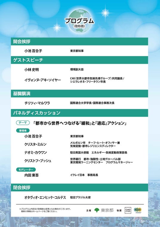 また、この会議は、都市の声をUNFCCC-COP(国連気候変動枠組条約締約国会議)に届ける「Town Hall COP」として日本で初めて開催します。都市の役割がかつてなく高まっている今、世界で知見を共有し、具体的な行動を呼びかけます。