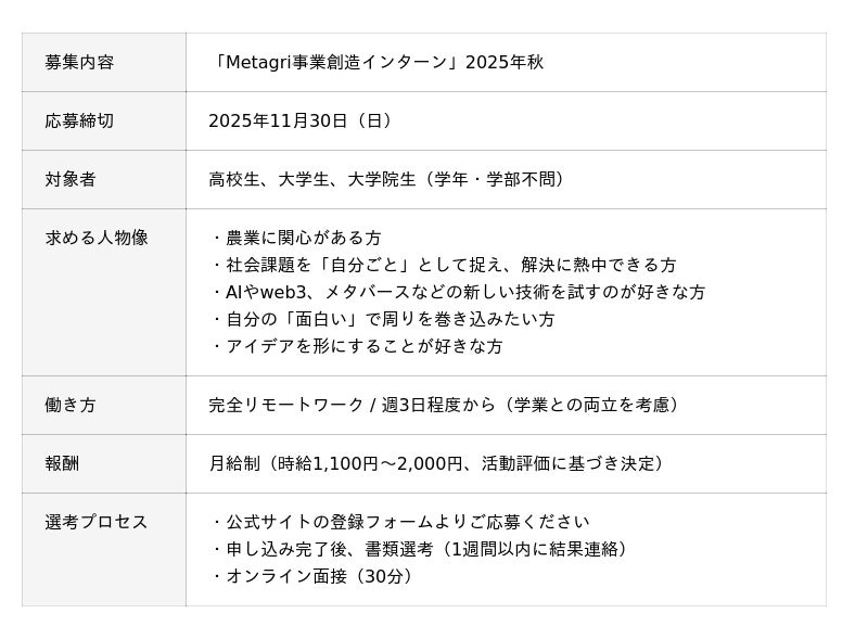 農業×AI×メタバースの最前線で社会変革に挑むMetagri研究所(運営:株式会社農情人)は、2025年秋のインターンシップ生の公募を開始しました。2年間で延べ20名以上のインターン生が参画し、累計10件を超える新プロジェクトを実現。日本の農業や地方が直面する深刻な課題を、AIやweb3、メタバースなどの先端技術で解決する、挑戦意欲に溢れた高校生・大学生を募集します。