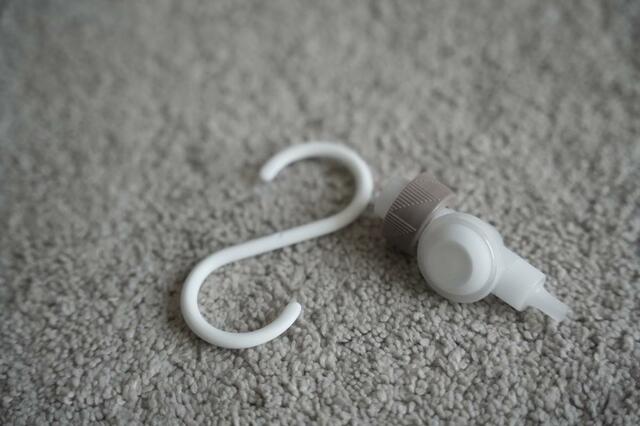 このように掛けておけば、ボトルの裏がぬるぬるするようなことにもならず、場所も取らず、逆さになっているので最後の1滴まで使いやすくて快適なんですよ。