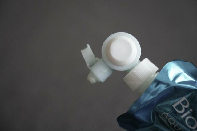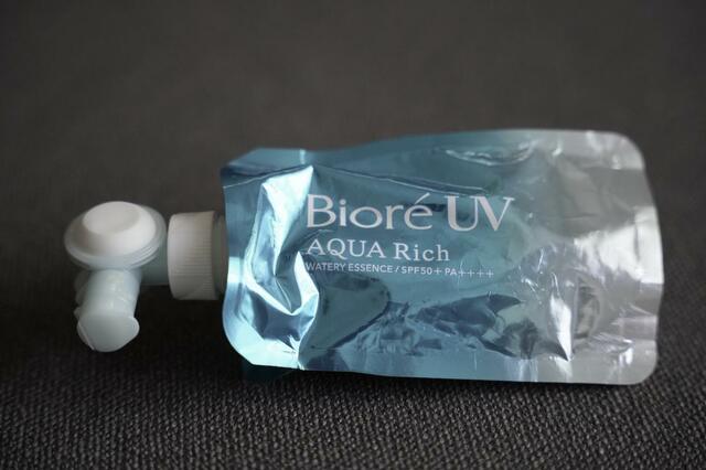 日焼け止めの「ビオレUV アクアリッチ」に、このフレッシュパウチのモデルがあるのですが、これは先ほどのらくらくスイッチにフタが付いて持ち運びしやすくなったようなモデル。