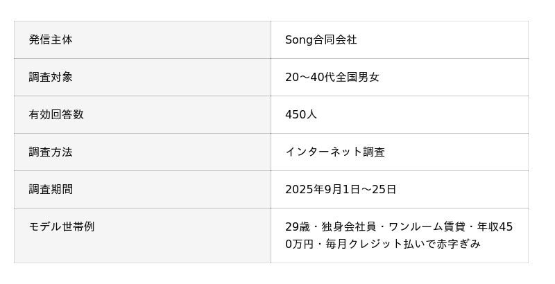 Song合同会社は、20~40代全国男女を対象に「お金の使いすぎと心の健康」に関する調査を実施しました。結果からは、ストレスが浪費を引き起こし、その浪費がさらにお金の不安を増幅させる“負の連鎖”が明らかになりました。本調査では、モデル世帯の1例として「29歳・独身会社員・ワンルーム賃貸・年収450万円・毎月クレジット払いで赤字ぎみ」というリアルな生活像も交え、現代若年層のメンタルと家計の関係を浮き彫りにしています。