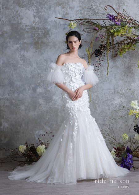 立体的なフラワーモチーフと華やかなチュールスリーブが目を引く、エレガントなマーメードラインのドレス。