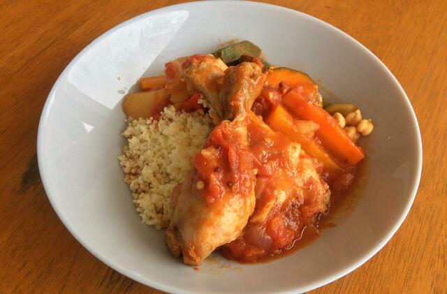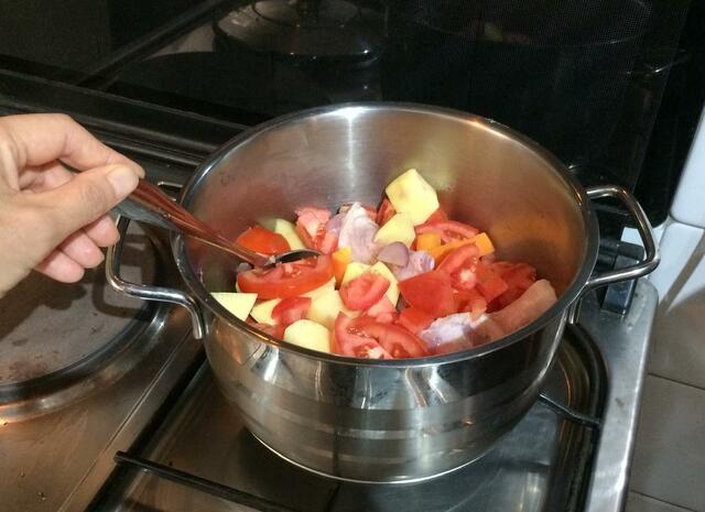 鶏肉とひよこ豆、そして玉ねぎや人参、じゃがいも、オクラ、ズッキーニ、パプリカ、セロリなどの野菜をトマトとともに煮込みます。PANAFで出されていた料理は野菜のサイズが大きめなので、今回は小さくカットしてみました。