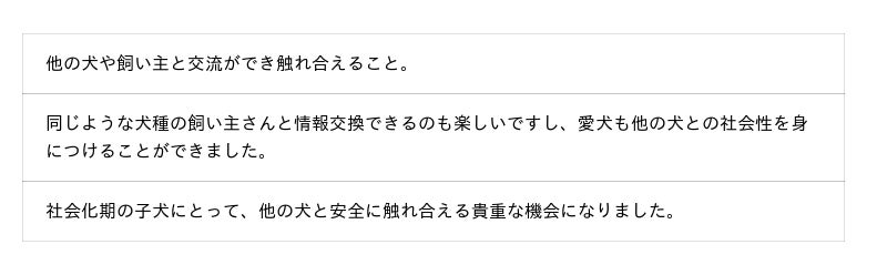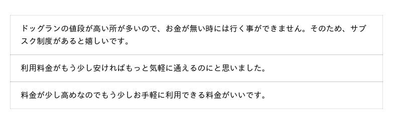 利用者は、「愛犬が気持ちよく遊べる環境が整っているか?」、そして「その料金が妥当であるか?」を重視していることがわかります。