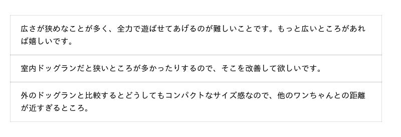 また、他の犬との距離が近すぎるとトラブルの原因になる可能性もあるので、広さの改善を求める声も聞かれました。