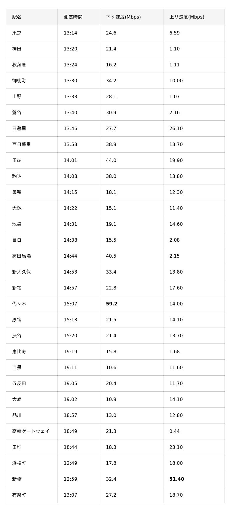 ・最速:新橋 51.4Mbps | 最遅:高輪ゲートウェイ 0.44Mbps