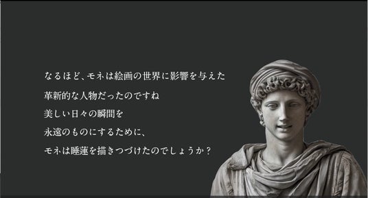 今回、新本館エントランスに導入した「デジタルアートミュージアム」では、ファシリテーターをデジタル化(アバター化)して「対話型鑑賞」を実現しています。日揮および株式会社電通の企画・制作、大原美術館(※2)のご協力のもと、同美術館に所蔵されている名画を大型デジタルサイネージで常設展示し、同美術館で導入している実際の「対話型鑑賞」を、アバターの解説とともに鑑賞することが可能です。世界的に著名な美術館で実施されている「対話型鑑賞」を、デジタル技術を用いて常時体験できる仕組みを病院に導入した例は、国内では初めて(※3)の取り組みとなります。