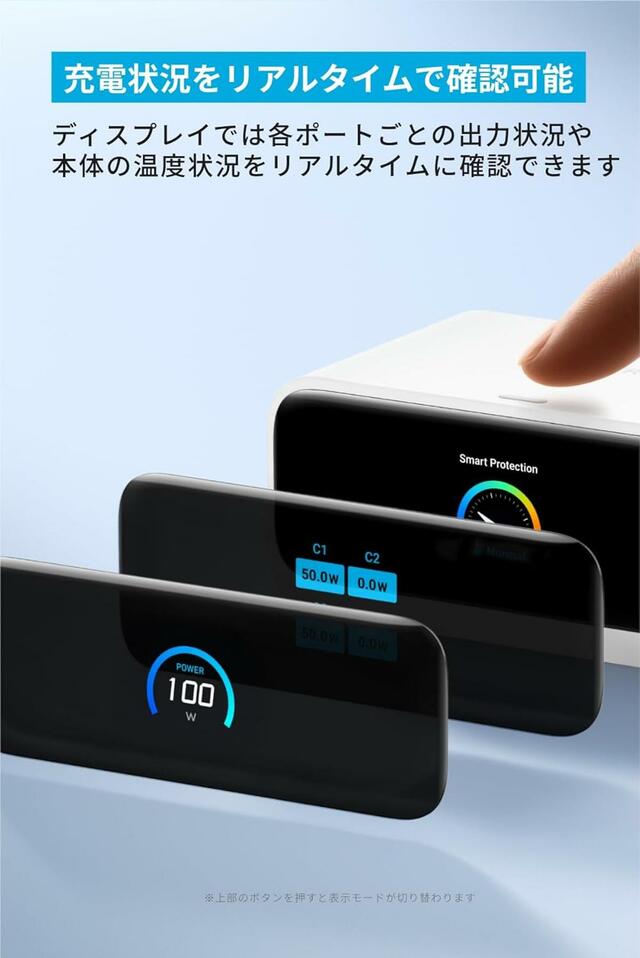 本体正面のディスプレイに各ポートの出力状況が表示されるのもGOOD。ディスプレイは1.3インチと大きく、見やすいですよ。