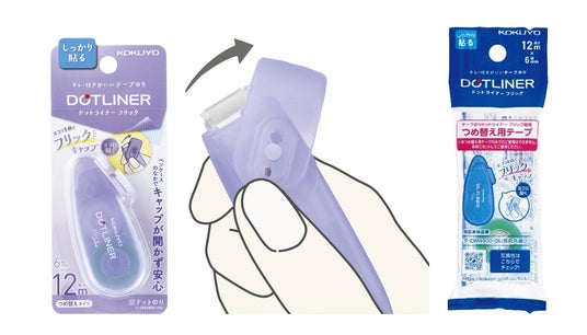キャップにバネを内蔵した新機構“フリックキャップ”と、つめ替えタイプのテープのりとして、業界最小クラスの本体サイズが特長の<ドットライナー>です。 “フリックキャップ”は、キャップが横方向にスライドして開閉することで、使用時はワンアクションで開けやすいのに、ペンケースの中では不意に開いてしまうことを防ぎます。さらに、フルカバーキャップを採用し、のり面にホコリやごみがつきにくくなりました。内部設計を最適化することによって実現した業界最小クラスのつめ替え式の本体は、コンパクトで持ち歩きやすく、テープのりも12mとたっぷり使えます。別売りの詰め替え用テープに交換することで、繰り返し使うことができます。