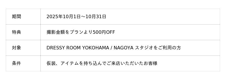 セルフ写真館 PICmiiは、カメラ専門店「カメラのキタムラ」のグループ会社として、撮影画質の仕上がりにこだわったセルフ写真館で、個室での自由な撮影をお楽しみいただけます。DRESSY ROOM YOKOHAMA/NAGOYAスタジオでは、10月限定で『ハロウィンキャンペーン』を実施。10月31日はハロウィン。 仮装、アイテムを持ち込んでご来店いただいたお客様には、撮影金額をプランより500円OFFにてご案内させていただきます。※ご予約時・ご来店時に「キャンペーンの記事を見た」とお伝えください。