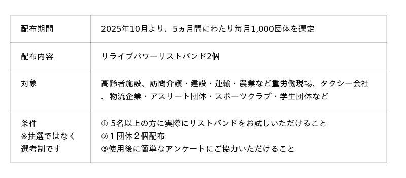 着用するだけで血行を促進し、身体のコンディションをサポートする革新的な技術を搭載した「リライブパワーリストバンド」を、全国の現場に無償配布する大規模モニタープロジェクト(10,000個、5,000団体対象)を開始いたします。本プロジェクトは、以下のような対象の方の身体パフォーマンスの課題に対して、テクノロジーの力で解決策を提示するものです。
